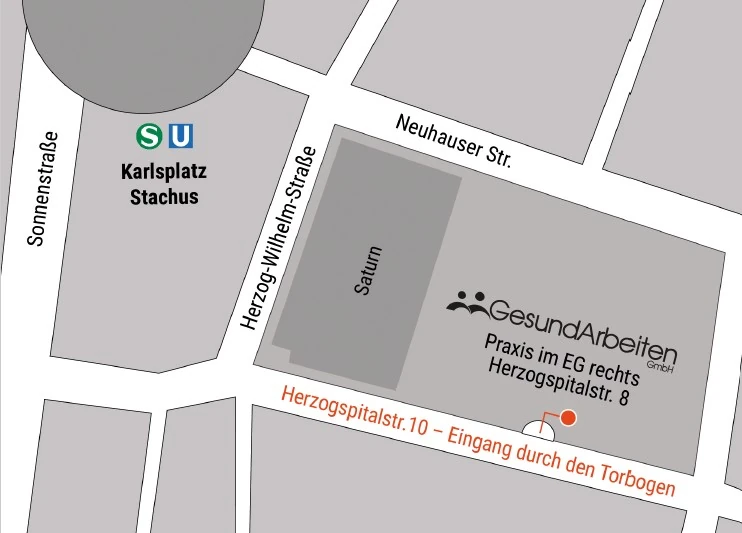 Unsere Praxis liegt nahe Stachus in der Herzogspitalstrasse 8 im EG, Eingang über die Herzogspitalstrasse 10 durch den Torbogen gleich rechts im EG.